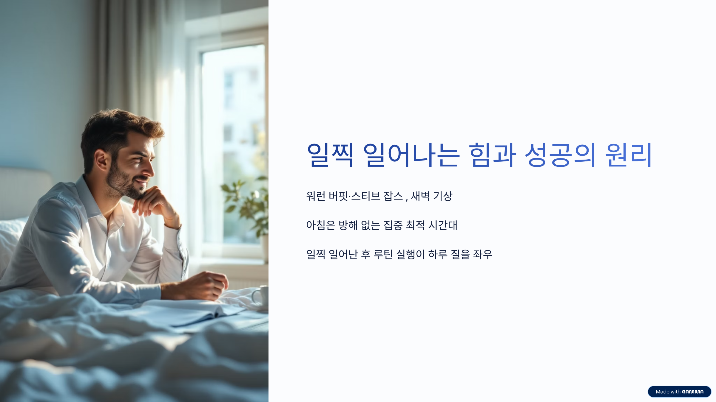 아침 시간은 ‘누구나 가질 수 있지만, 아무나 활용하지 못하는’ 기회의 창이에요. 오늘 소개한 습관 중 하나라도 실천해본다면 분명히 삶에 긍정적인 변화가 찾아올 거예요. 시작이 반이라는 말처럼, 내일 아침부터 작은 변화 하나 시작해보는 건 어떨까요?