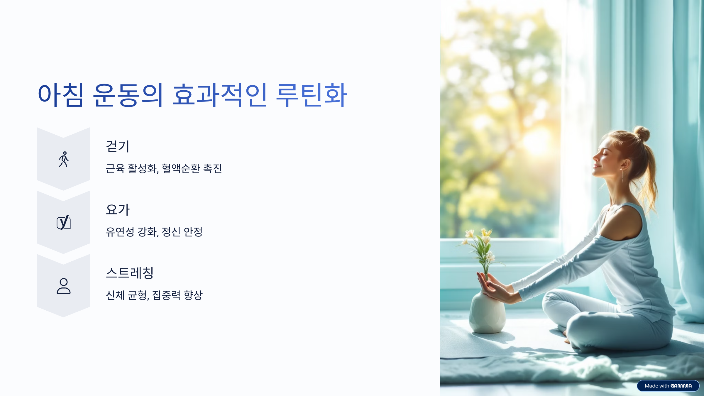 아침에 가벼운 운동을 하는 것만으로도 하루 전체 에너지 레벨이 달라질 수 있어요.