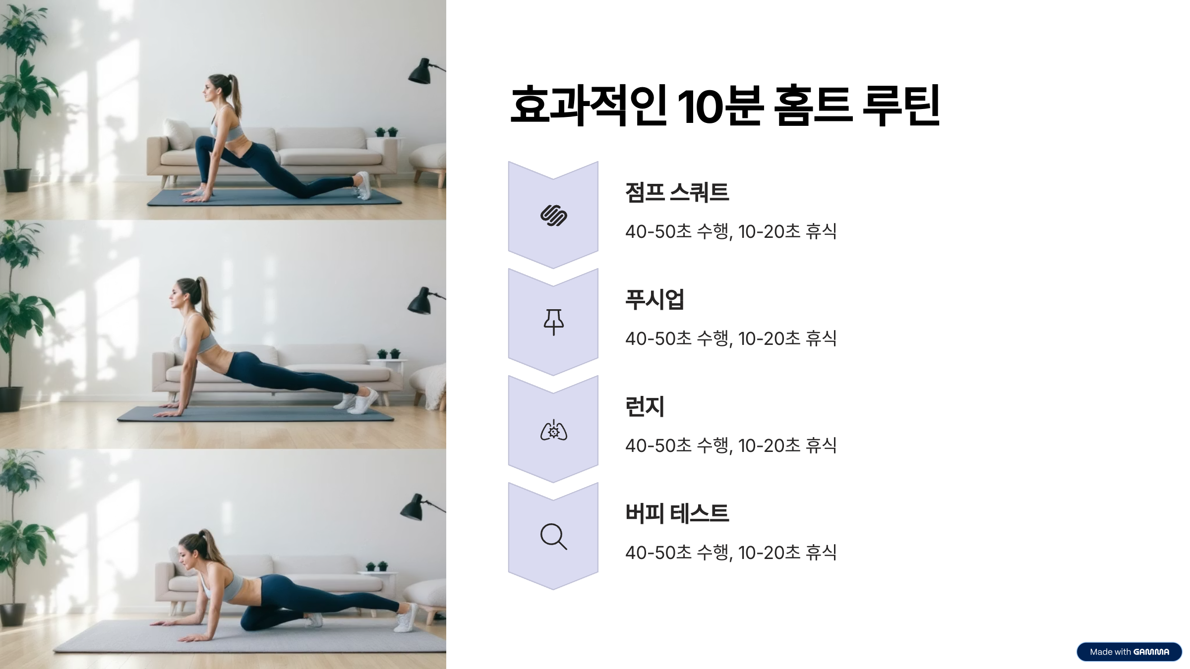많은 사람들이 “10분 운동으로 뭐가 바뀌겠어?”라고 생각해요. 그런데 의외로 10분 운동의 효과는 과소평가되어 있는 경우가 많답니다. 특히 근력 운동이나 인터벌 트레이닝은 짧은 시간에도 대사율을 높이고 근육을 자극하기에 충분해요. 규칙적으로만 해도 체력 향상과 스트레스 해소에 큰 도움이 되죠.